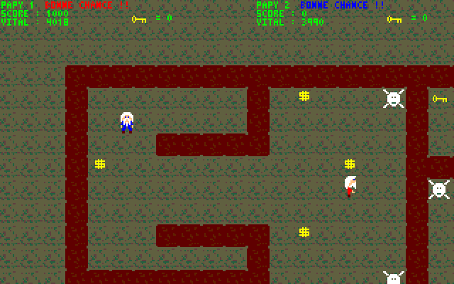Il s'agit d'un jeu de labyrinthe un peu comme Gauntlet. Fait avec FUNIT, mon propre moteur graphique pour MSDOS (basé sur le mode graphique "13h" de MSDOS), en Pascal/assembleur, que j'avais fait alors que j'étais éleve en terminale.